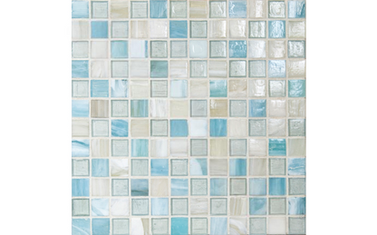 This stunning glass pool tile blends pastel blue and green with white and beige, creating a serene coastal aesthetic.