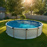 A durable and stylish 24' round above-ground pool with a 52" wall height, perfect for larger families and backyard gatherings.