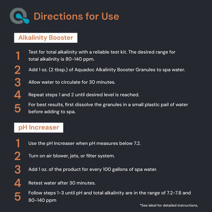 - Add 1 oz. (2 tbsp.) of AquaDoc Alkalinity Booster Granules to spa water.
