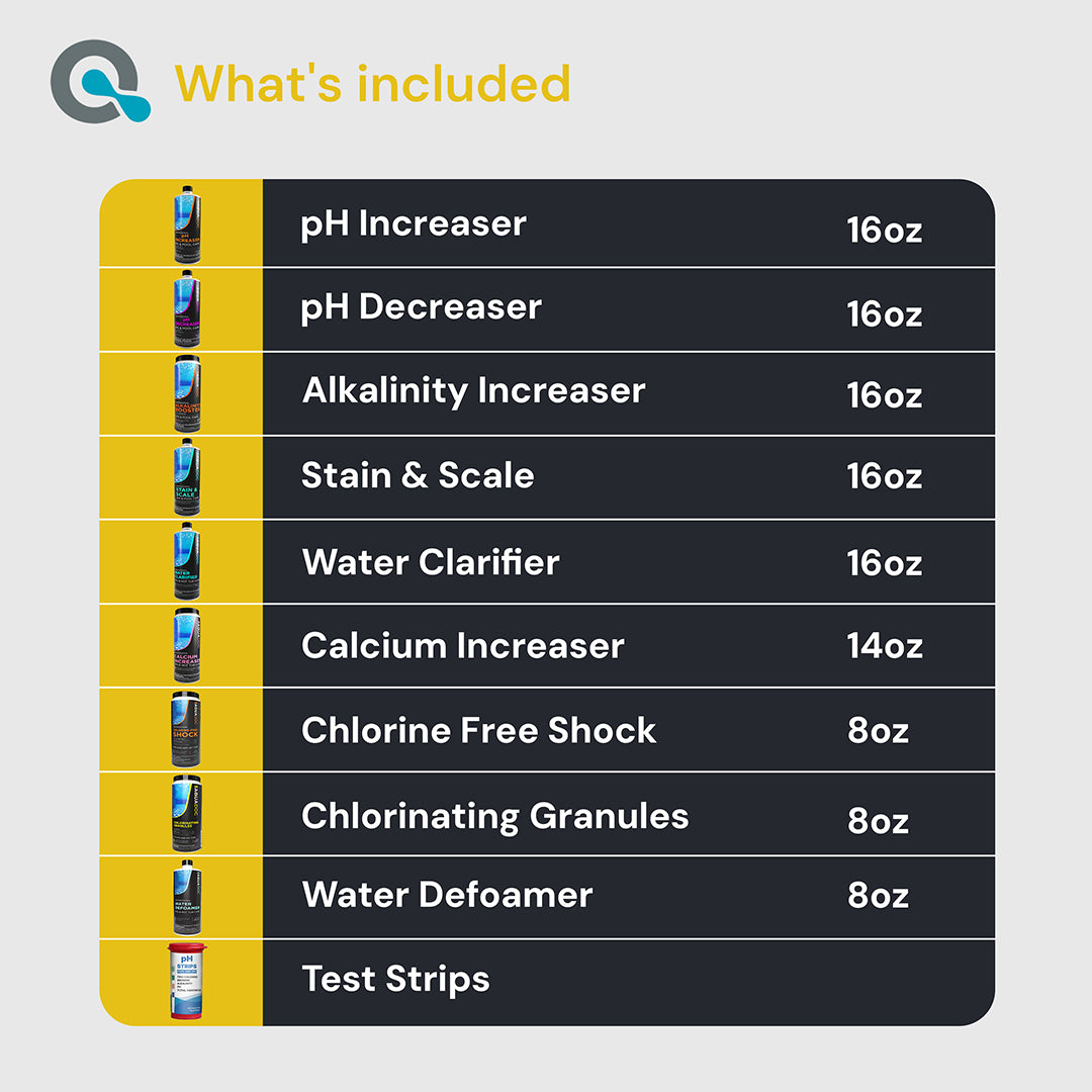 - Test water using Test Strips; adjust total alkalinity, pH levels, and calcium hardness using pH Increaser, pH Decreaser, Alkalinity Increaser & Calcium Increaser accordingly
